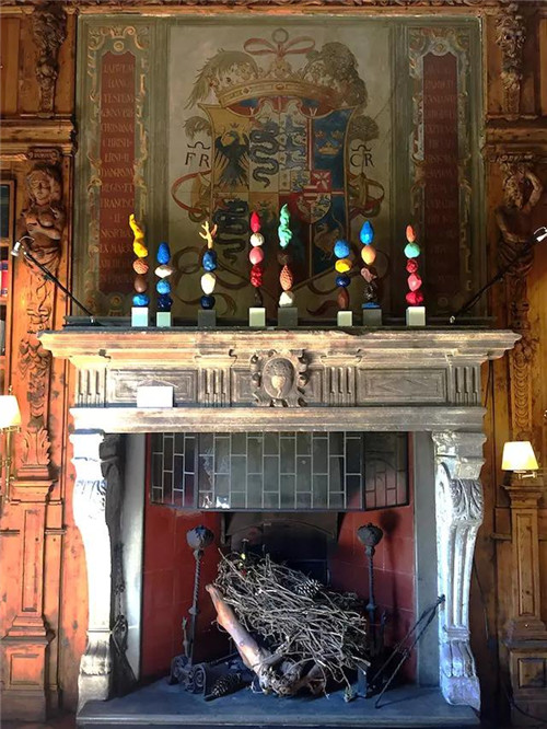 英國(guó)室內(nèi)設(shè)計(jì)師 Ashley Hicks 手工制作的桌面圖騰裝飾被擺設(shè)在巨大的壁爐上。
