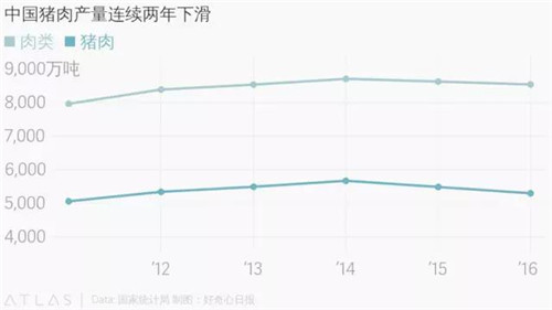 一直以來,中國都是肉類消費(fèi)大國。按照美國農(nóng)業(yè)部的估計(jì),中國消費(fèi)者今年所食用的豬肉、牛肉和雞肉加起來會是美國消費(fèi)者的兩倍。不過,國家統(tǒng)計(jì)局的數(shù)據(jù)顯示,2015 年開始,中國肉類消費(fèi)有所下降。去年,國內(nèi)肉類產(chǎn)量同比下降了 1%,而占比最高的豬肉產(chǎn)量同比減少了 3.4%。