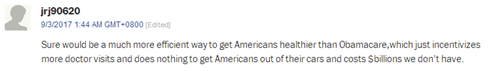 網(wǎng)友jrj90620:“對(duì)美國(guó)人的健康來(lái)說(shuō),共享單車可比奧巴馬醫(yī)保更有效?!?/font>