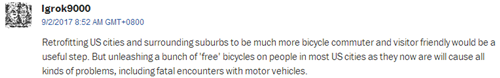 網(wǎng)友Igrok9000:“使用自行車確實(shí)利于改善城市和郊區(qū)環(huán)境。但對(duì)于美國(guó)大多數(shù)城市來(lái)說(shuō),一下子涌現(xiàn)出大量自行車,會(huì)引發(fā)各種各樣的問(wèn)題,比如與機(jī)動(dòng)車相撞?!?/font>