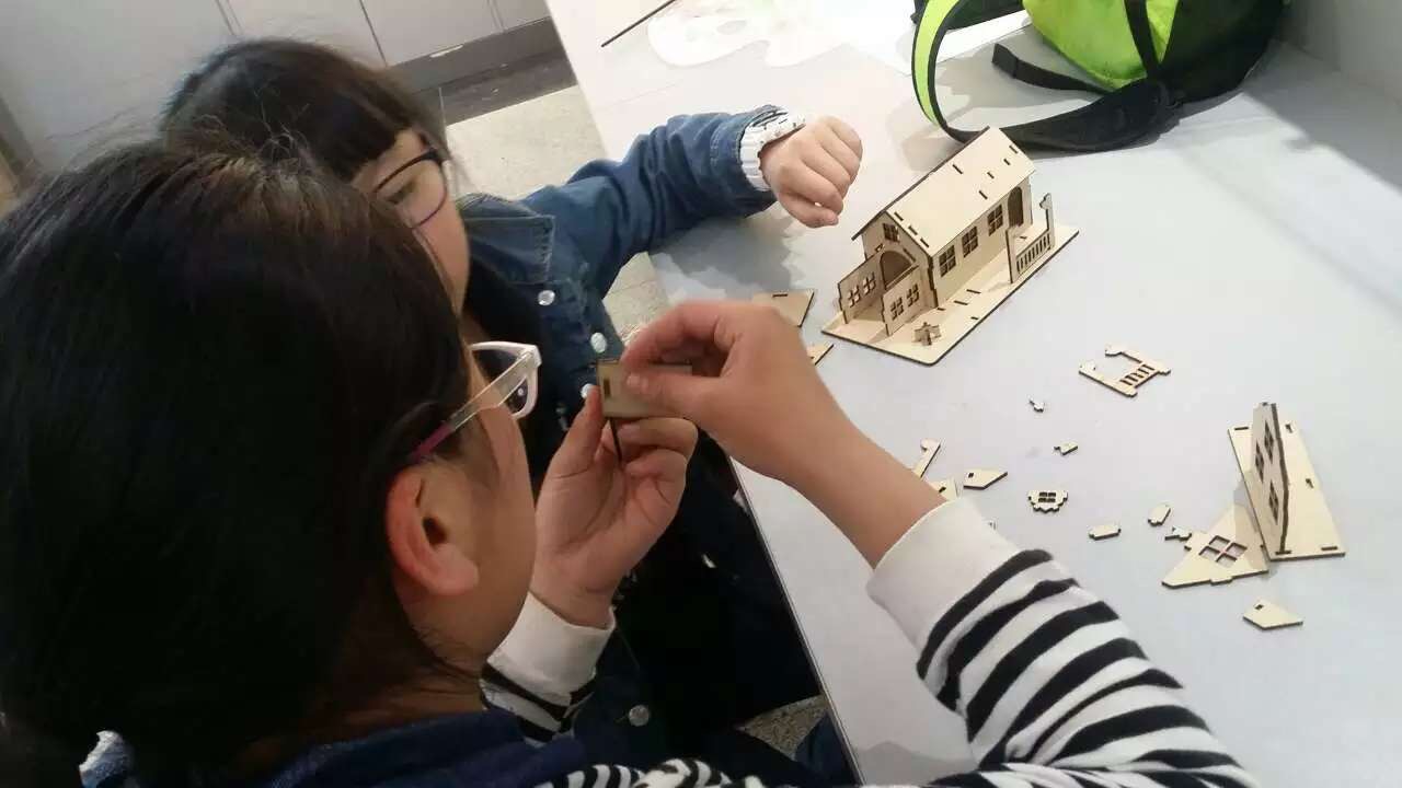 在激光加工區(qū),用激光機切割而成的大小不一、形狀各異的零件引起了同學們的興趣。同學們齊心協(xié)力,將一個個零件拼裝成了房屋模型??粗粭潡潉e墅呈現(xiàn)在眼前,孩子們歡呼雀躍,體驗著動手動腦的樂趣,感受著成功的喜悅。