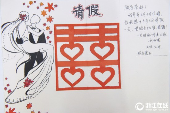 9月19日,在浙江理工大學藝術(shù)與設計學院,老師顧紅建正在展示學生們交上來的請假條。這些請假條風格多變,充滿創(chuàng)意,有簡筆畫風格的,也有抽象的。比如有學生畫了一班開走的列車和一個追趕的小人兒,表示趕不上末班車而遲到;有的把假條做成了賀卡,折頁打開一個大紅喜字,畫上浪漫的婚禮現(xiàn)場,用中英文寫上請假“文案”,原來是參加姐姐的婚禮。顧老師說,讓學生制作手繪假條,希望學生們學會在生活中用藝術(shù)語言敘事,同時也想幫學生們留下大學生活的回憶。(浙江在線記者 楊曉軒 李翔 于詩奇 攝)