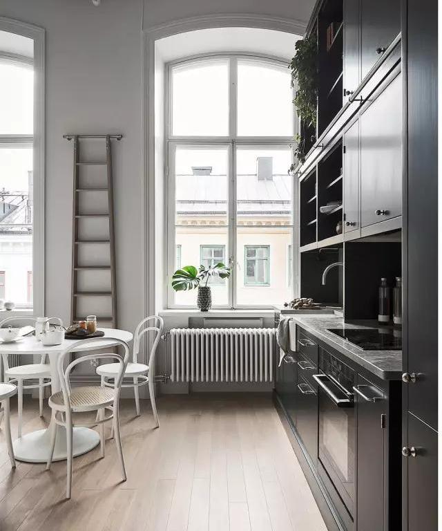 整個(gè)公寓的特點(diǎn)在于它足夠的層高,黑色廚房是空間的重心,同時(shí)也讓空間顯得更加優(yōu)雅簡約。木色、金屬色以及植物盆栽是點(diǎn)綴這塊最好的裝飾。足夠的存儲(chǔ)空間,也許對于實(shí)用方面或許不夠便捷,然而木質(zhì)樓梯是很好的解決辦法。