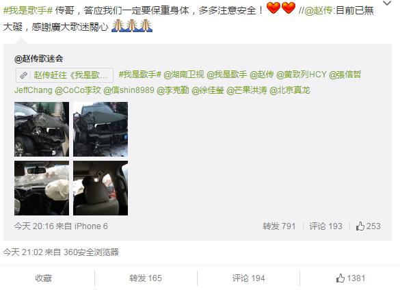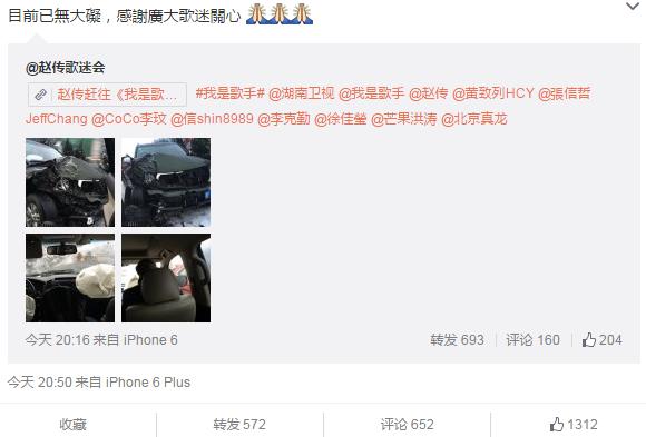2月4日晚,ID為“趙傳歌迷會”的微博發(fā)布了一篇文章,描述了歌手趙傳在前往《我是歌手》錄制現(xiàn)場的途中發(fā)生車禍的情況。文章發(fā)布后不久就引發(fā)了網(wǎng)友熱議,趙傳本人也轉(zhuǎn)發(fā)了該微博并寫到:“目前已無大礙,感謝廣大歌迷關(guān)心”。確認(rèn)了消息的真實(shí)性。