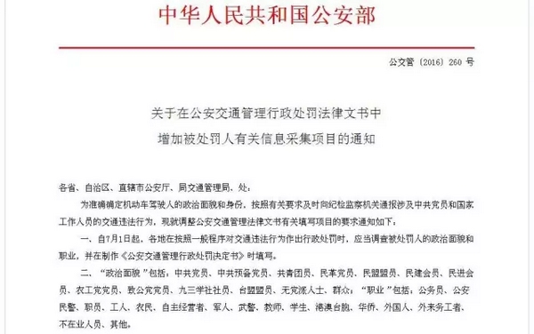 2016年7月1日起,機(jī)動車駕駛?cè)藢?shí)施交通違法行為后,公安交通管理部門在對交通違法作出行政處罰時(shí),被處罰人的政治面貌和職業(yè)信息將被調(diào)查,涉及中共黨員和國家工作人員的將被通報(bào)紀(jì)檢監(jiān)察機(jī)關(guān)。