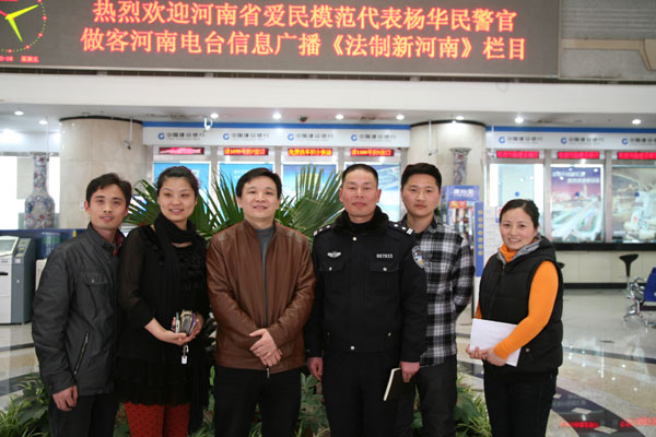 2012年3月16日下午四點(diǎn),中央電視臺(tái)攝制組進(jìn)入河南電臺(tái)信息廣播《法制新河南》節(jié)目直播間進(jìn)行了拍攝。在節(jié)目中做客的是全國(guó)愛(ài)民模范鄭州市花園路農(nóng)業(yè)路楊華民交通示范標(biāo)準(zhǔn)崗崗長(zhǎng)楊華民。