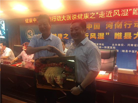 07月23日上午,由河南省衛(wèi)計委宣傳處指導(dǎo),河南省醫(yī)學(xué)科普學(xué)會、醫(yī)藥衛(wèi)生報主辦的“健康中國 河南行動 大醫(yī)說健康”開啟第二站:“走進風(fēng)濕”睢縣大型醫(yī)學(xué)科普宣講義診活動。