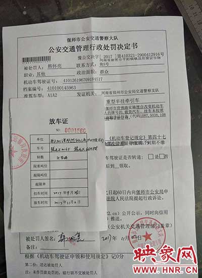 11月2日下午16時許,偃師市交警大隊給韓先生開具了公安交通管理行政處罰決定書【2017】410321-2900412916號,處罰900元。韓先生急匆匆去交了900元罰款后,拿了交警隊的交款單去了交通局,交通局于當天晚上17時30分許,給韓開具放車單。韓去停車場看到自己的車時,已經(jīng)是當天晚上20時以后了。