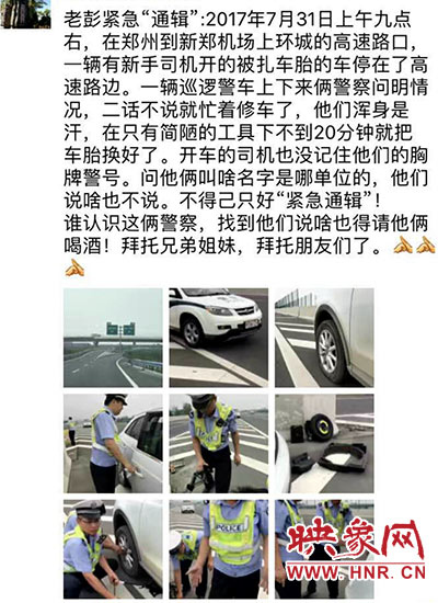 據(jù)介紹,7月31日9時(shí)許,河南省公安廳高速交警總隊(duì)一支隊(duì)執(zhí)勤民警徐玉成、余曉偉巡邏到機(jī)場(chǎng)高速與鄭州西南繞城高速互通處附近時(shí),看到北向南方向一輛白色轎車停在高速路邊,上前一看車輛前輪輪胎爆胎了,司機(jī)急著去開會(huì)卻不會(huì)修車,急得滿頭大汗卻無從下手,民警了解情況后,二話沒說在酷暑高溫天氣迅速幫司機(jī)把車胎換好,司機(jī)連聲表示感謝,由于當(dāng)時(shí)急著去開會(huì),沒有來得及問出民警姓名,于是就出現(xiàn)了開頭“緊急通緝”的一幕,公司領(lǐng)導(dǎo)和員工也紛紛轉(zhuǎn)發(fā)正能量,“通緝”找人。伸手幫一把,傳遞正能量一大片。