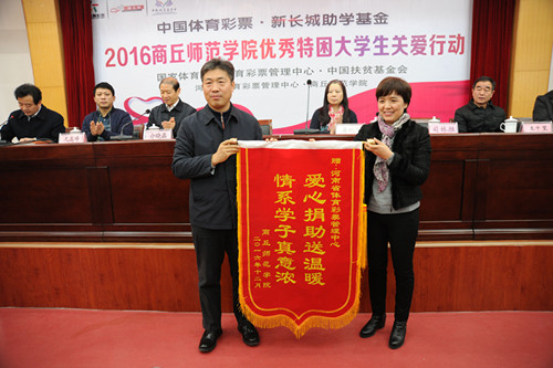 河南省體育彩票管理中心書記王海新接受受助方錦旗