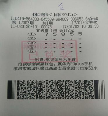 1月2日晚,第17002期排列五開獎,開獎號碼是“75855”,漯河彩民喜中10萬元大獎1注,這也是當(dāng)?shù)?017年第1注排列五大獎。