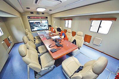 該車整車自重16噸,在車輛內(nèi)部,有一個(gè)近20平方米的會議室,能同時(shí)坐下十多人。