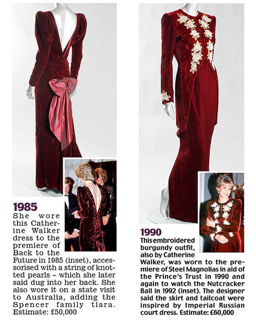 左:Catherine Walker酒紅色天鵝絨禮服。戴安娜王妃曾穿著它訪問澳大利亞,1985年出席電影《回到未來》的首映禮時(shí)也同樣穿的這件禮服。估價(jià):5萬英鎊