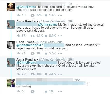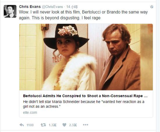 《美國隊長》克里斯·埃文斯(Chris Evans)也表示:“天啊,我再也無法像過去那樣看待這部片子、貝托魯奇或白蘭度,這已經(jīng)超越了惡心,我覺得很憤怒!”他的發(fā)文也引來許多網(wǎng)友認(rèn)同,連《歌喉贊》女主角安娜·肯德里克(Anna Kendrick)也在底下回應(yīng)表示,“施耐德女士之前曾在訪談中說過,‘我曾提起過這件事情,聽的人(男人們)還翻白眼’?!?/p>