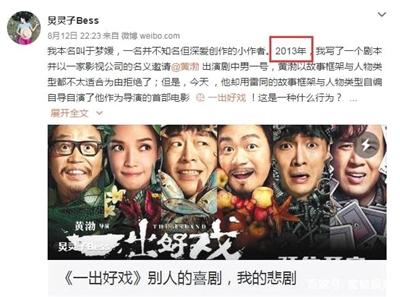 上映4天,黃渤導演的處女作《一出好戲》票房破6億。然而,8月12日晚,一位名叫于夢媛的編劇在微博發(fā)文稱,黃渤的《一出好戲》涉嫌抄襲她2013年寫的劇本《男人危機》。她在文中說道:“2013年,我寫了一個劇本并以一家影視公司的名義邀請黃渤出演劇中男一號,黃渤以故事框架與人物類型都不太適合為由拒絕了;但是,今天他卻用雷同的故事框架與人物類型自編自導自演了他作為導演的首部電影《一出好戲》!”新京報第一時間聯(lián)系了黃渤導演以及編劇于夢媛,兩人均未做出回應(yīng);隨后又聯(lián)系了當時參與《男人危機》籌備工作的工作人員張進(化名),還原了當時的一些事情經(jīng)過。