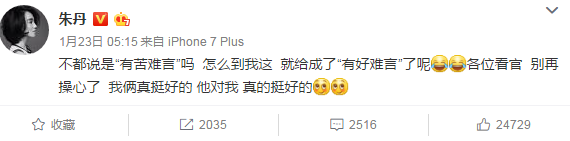 這要是兩位單身,或許還好一點,關(guān)鍵是這可是兩個為人父母的,說出這么高山流水覓知音的話,確實不合適。不但如此,周一圍的夫人,朱丹在微博里一直為老公賣力宣傳。