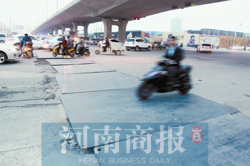 昨天下午,記者在現(xiàn)場看到,隴海高架橋黃河南路(西向東方向)下橋口南北兩側(cè),20余塊鋼板一字鋪開,鋼板路長約50米、寬約2米,車輛經(jīng)過時,鋼板與路面不斷發(fā)出沉悶的撞擊聲。