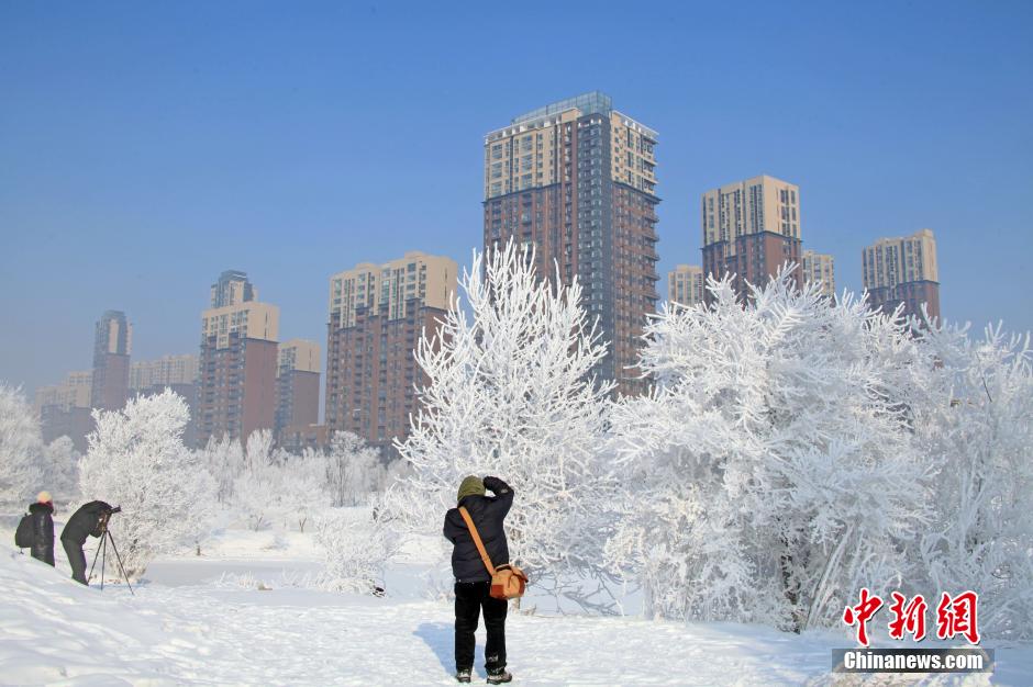 2014年1月21日,游客在吉林省吉林市松花江畔附近拍攝霧凇美景。吉林市2014年首場大雪后,松花江畔銀裝素裹,出現(xiàn)霧凇美景。中新社發(fā) 朱萬昌 攝 圖片來源:CNSPHOTO
