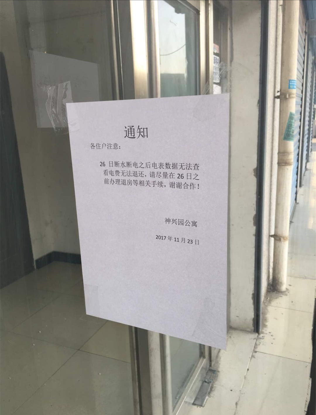?。ǜ鶕?jù)通州臺湖鎮(zhèn)政府下發(fā)的通知,亦園青年創(chuàng)業(yè)園周邊5家公寓應(yīng)于11月26日全面停水停電,圖為5家公寓之一的神興園公寓的通知 饒賢君/攝)