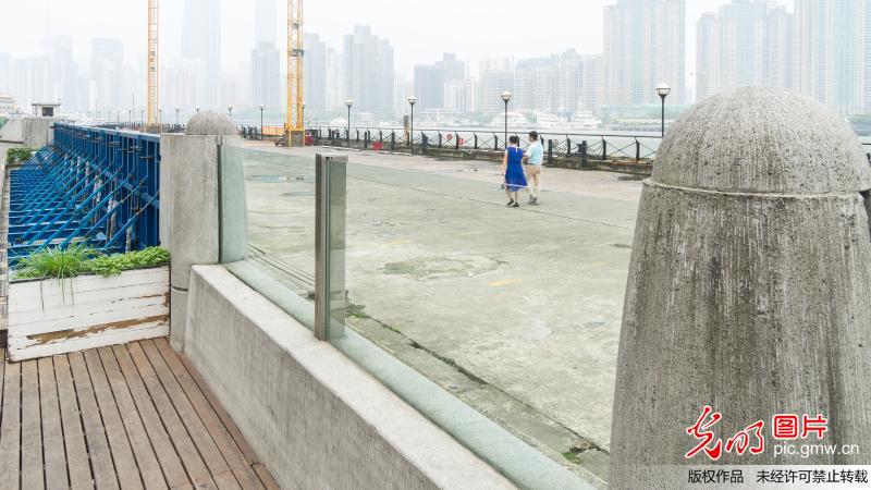 當(dāng)日中午,走訪南外灘老碼頭,見到這一長達數(shù)十米,由鋼筋混凝土墻體和通透式玻璃組合而成的"抗洪神器",其中雙層玻璃防汛墻的厚度達到18毫米,既滿足防汛擋水需要,同時方便游客坐在岸堤邊欣賞老碼頭和江岸景色。(王岡攝/光明圖片)