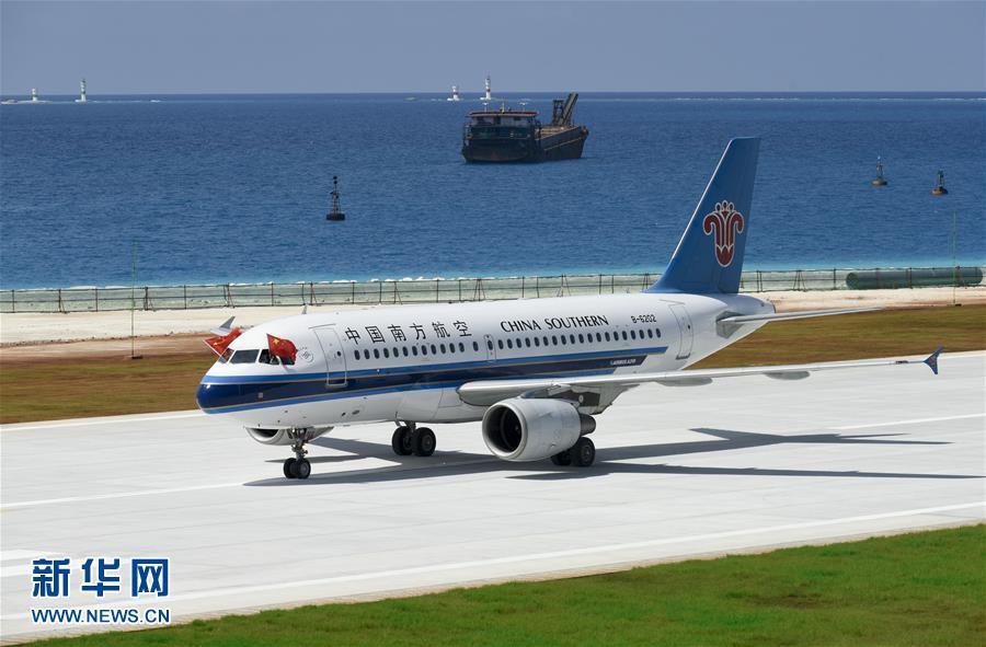 7月13日,南方航空公司的客機在美濟礁新建機場著陸。新華社記者 陳益宸 攝 圖片來源:新華網(wǎng)