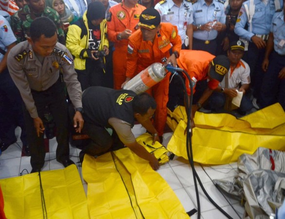 當(dāng)?shù)貢r間2014年12月30日,印尼龐卡蘭布翁,印尼搜救部隊(duì)準(zhǔn)備尸袋前往飛機(jī)失事地點(diǎn)打撈殘骸和遺體。