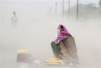 2015年5月20日,印度新德里,當?shù)卦庥鰢乐厣硥m暴天氣,空氣污染嚴重。