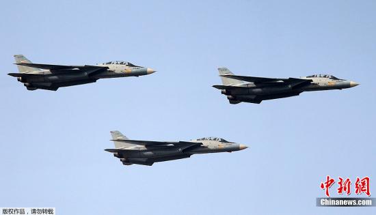 當(dāng)?shù)貢r(shí)間2012年4月17日,伊朗舉行大型軍隊(duì)閱兵式慶祝建軍節(jié)。圖為伊朗空軍F-14戰(zhàn)機(jī)飛過檢閱臺。