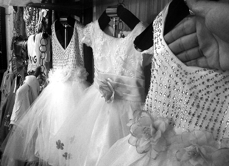 “這個(gè)送珍珠腰帶,走(賣)得可好,帶一件吧!”昨天下午2點(diǎn),鄭州市豐產(chǎn)路某店鋪內(nèi),女老板正在向一位女士推銷熱賣的“公主裙”。仔細(xì)看,這條粉紅色的裙子,腰間綴著由花生米大小的“珍珠”做的腰帶,袖口邊緣處還貼著亮閃閃的貼片,看著確實(shí)華麗。經(jīng)過(guò)一番討價(jià)還價(jià),該女士花100元為上幼兒園的女兒買了條裙子。令她不滿意的地方,就是似乎珍珠腰帶縫得并不緊,“珍珠是一根單線穿下來(lái)的,穿不了幾次,就該斷了”。
