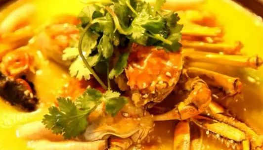 這道連機(jī)器人都要激動(dòng)得把持不住的菜品呢,是這里的招牌菜湖蟹煲了。這道菜好吃的訣竅之一呢,就是食材好。正宗的陽(yáng)澄湖大閘蟹,蟹膏豐滿晶瑩剔透相當(dāng)誘人。這道菜的做法其實(shí)是相當(dāng)簡(jiǎn)單的,簡(jiǎn)單的炸制之后呢,就是用高湯煨煮,燉出原汁原味。