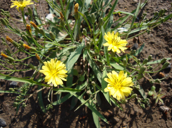 原生形態(tài):抱莖苦荬菜多年生草本,高可達(dá)1米許。根粗壯而垂直。莖直立。根生葉排成蓮座狀,葉片長圓狀倒披針形,倒向羽裂狀或羽狀缺刻,先端短尖或鈍圓,基部慚狹成柄,花期通常不萎落;莖生葉基部抱莖。頭狀花序排成傘房狀;總苞圓摘狀,外層苞片極短小,內(nèi)層苞片線狀披針形;花黃色,全部為舌狀花,先端5齒裂;花柱細(xì)長,柱頭2裂,冠毛白色,一層。瘦果紡錘形,稍扁,果喙長約為瘦果的1/4,通常與瘦果不同色?;ㄆ诖杭?。生于山腳、路邊、疏林內(nèi)、河邊。